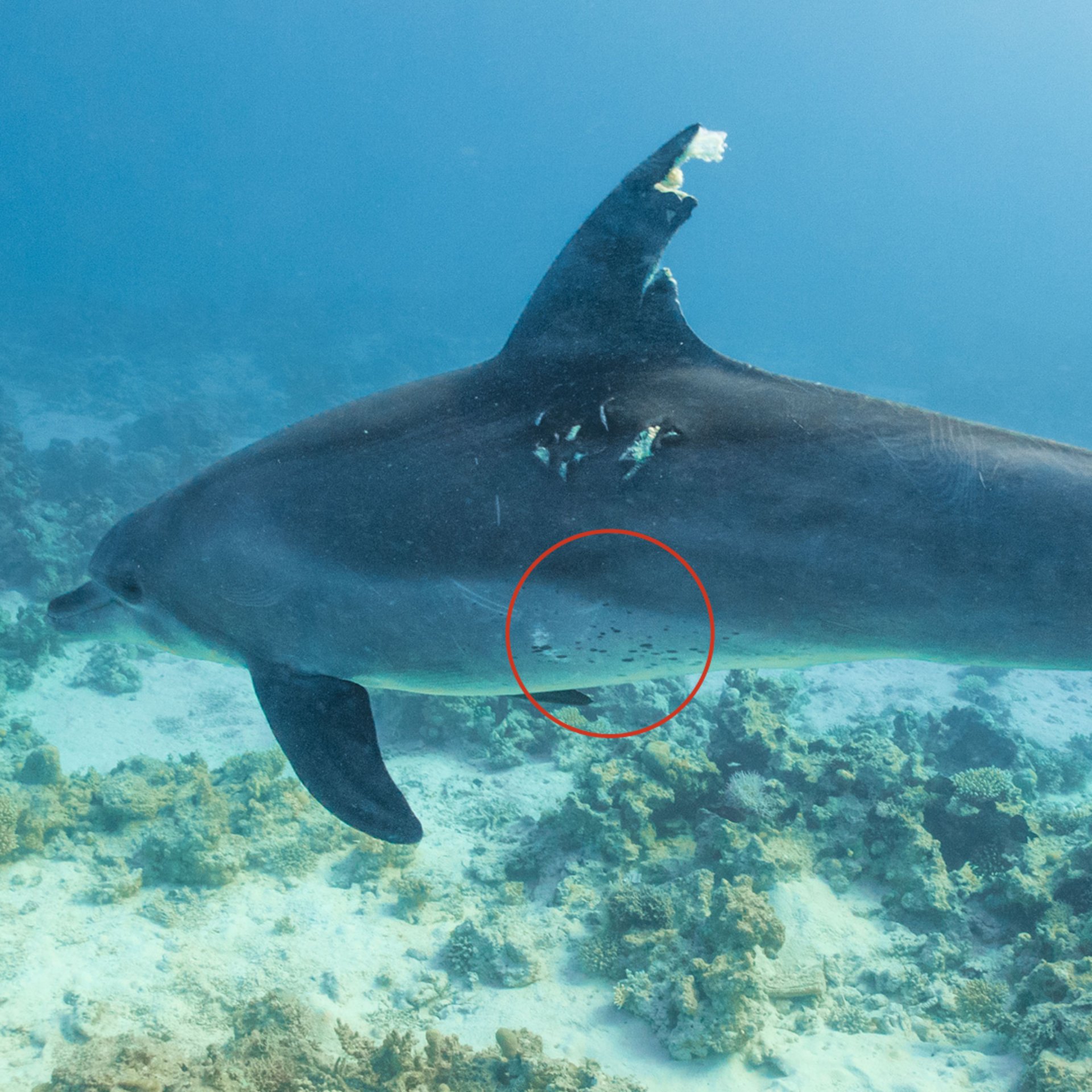 Normalerweise verlassen wir uns auf Bilder der Rückenflosse zur Identifizierung von Delfinen. Manchmal fangen wir auch Bilder der Schwanzflosse oder anderer Körperteile ein, die über die Wasseroberfläche ragen. Traditionell werden diese Fotos von Booten aus gemacht, sodass wir nur das sehen, was über der Oberfläche ist. Aber hier in Ägypten haben wir das unglaubliche Glück, auch Unterwasseraufnahmen zu machen! Das bedeutet, dass wir Delfine anhand ihrer einzigartigen Markierungen, Flecken und Kratzer am ganzen Körper identifizieren können.