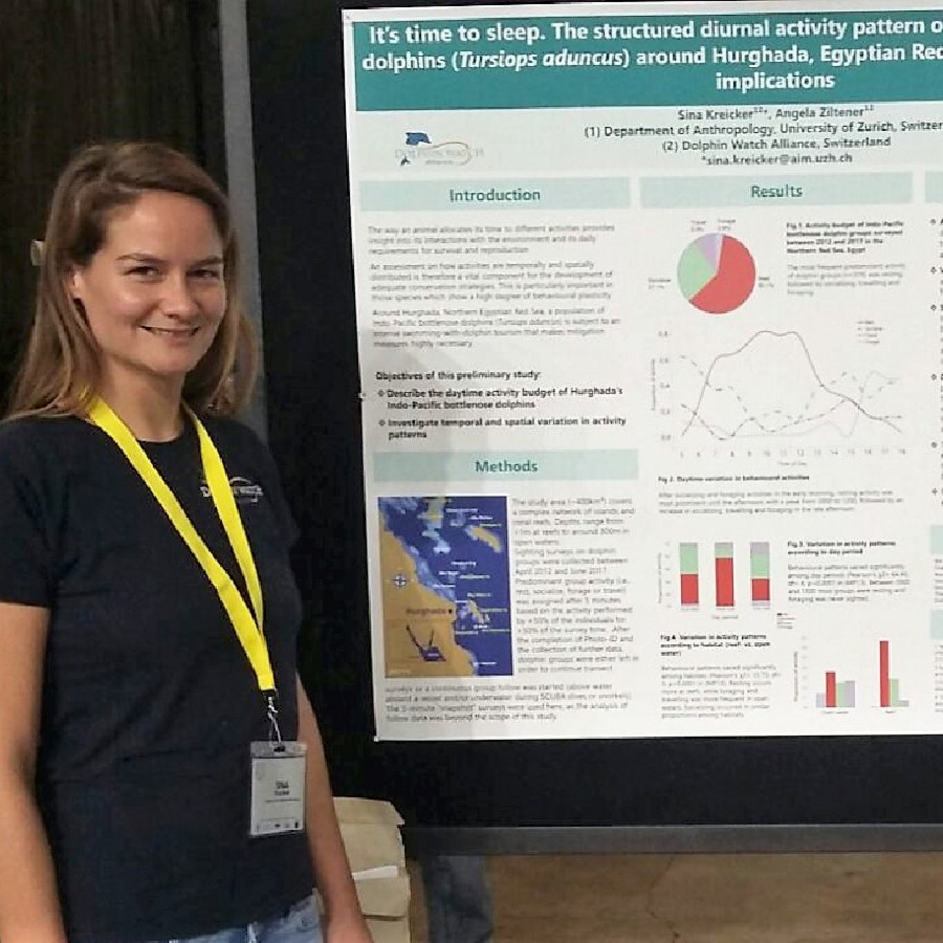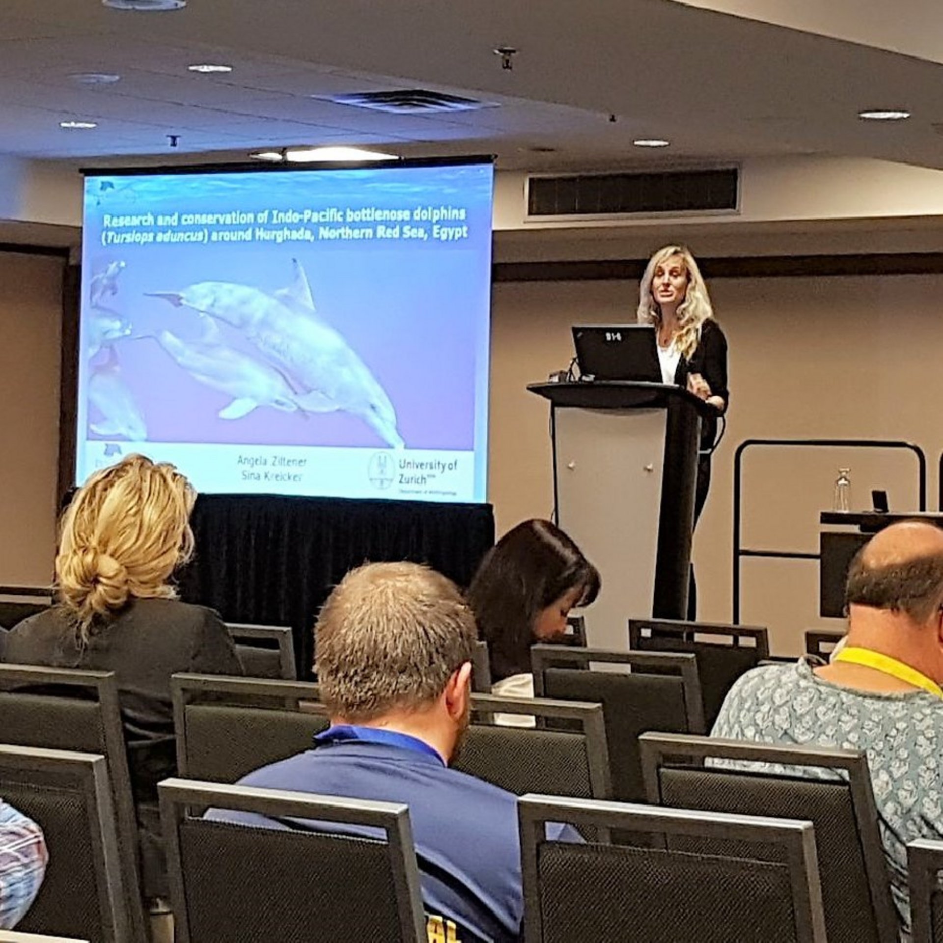 Angela Ziltener, Präsidentin von Dolphin Watch Alliance sprach über Forschung und Schutz der Delfine im Roten Meer am Society for Marine Mammalogy Kongress in Halifax, Canada. Poster Präsenation über die Tagesaktivität der Indo-Pazifischen Bottelnose Delfine von Sina Kreicker.