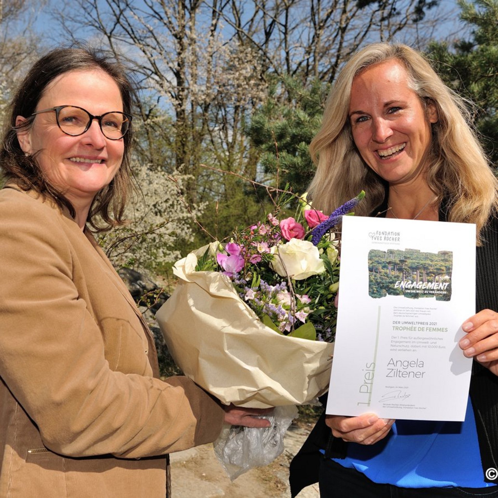 We are particularly pleased about the first prize, the "Trophée de femmes" environmental prize, which was awarded to our President Angela Ziltener by the Yves Rocher Foundation: