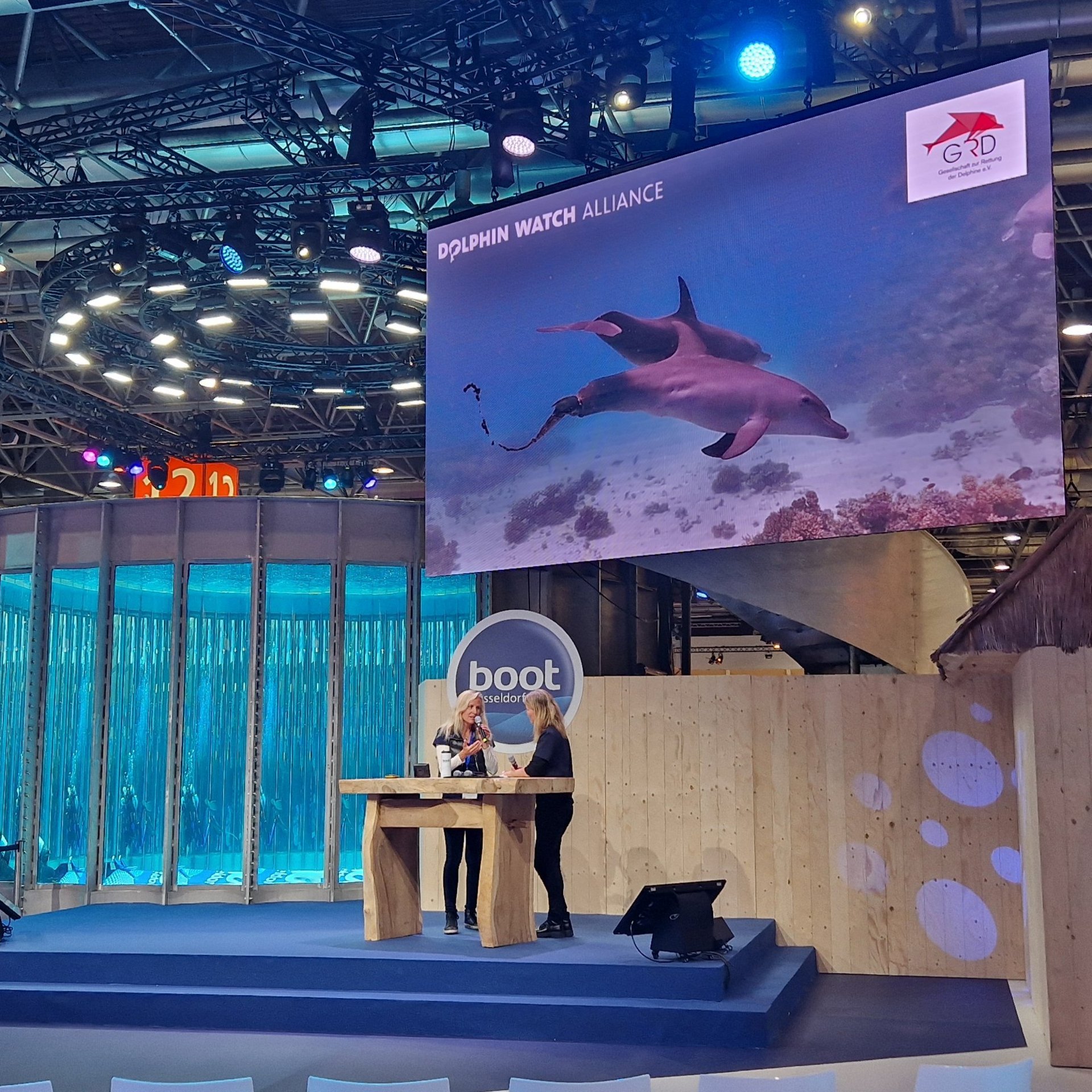 During the Boot Düsseldorf, our president Angela Ziltener delivered several presentations titled «Are dolphins increasingly victims of entanglements? – A case study from Egypt». She provided insights into the biology of Indo-Pacific bottlenose dolphins, the guidelines to follow, and the growing threat of entanglements for all marine life. We were present at the booth of the Society for Dolphin Conservation (GRD) and received support from Aquatil and the German Marine Conservation Foundation.