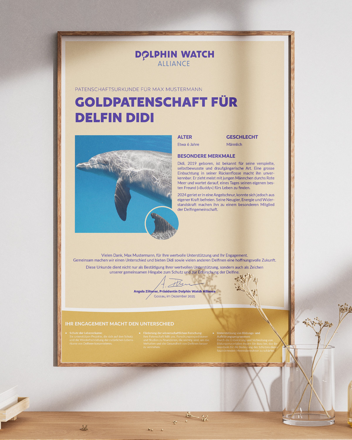 Schenke eine Delfinpatenschaft und mache doppelt Freude – den Beschenkten und den Delfinen im Meer. Zu Weihnachten kannst du dir unser Aktionsangebot sichern: Zu jeder Patenschaft schenken wir dir gratis einen Bilderrahmen mit deiner personalisierten Patenschaftsurkunde (Zertifikat) – perfekt, um dein Geschenk direkt unter den Weihnachtsbaum zu legen oder langfristig sichtbar zu machen.